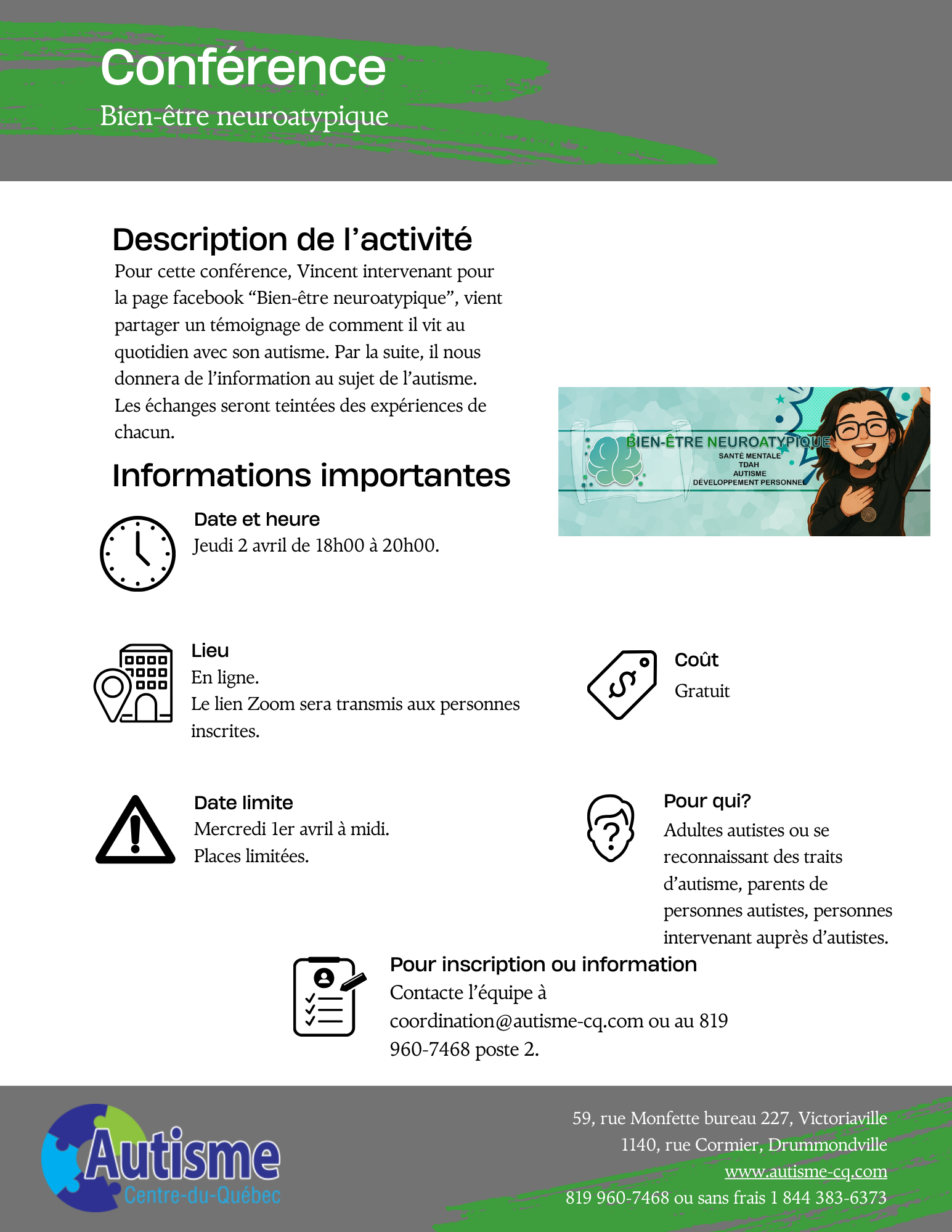 Pour inscription ou information 819 960-7468 poste 2 ou coordination@autisme-cq.com