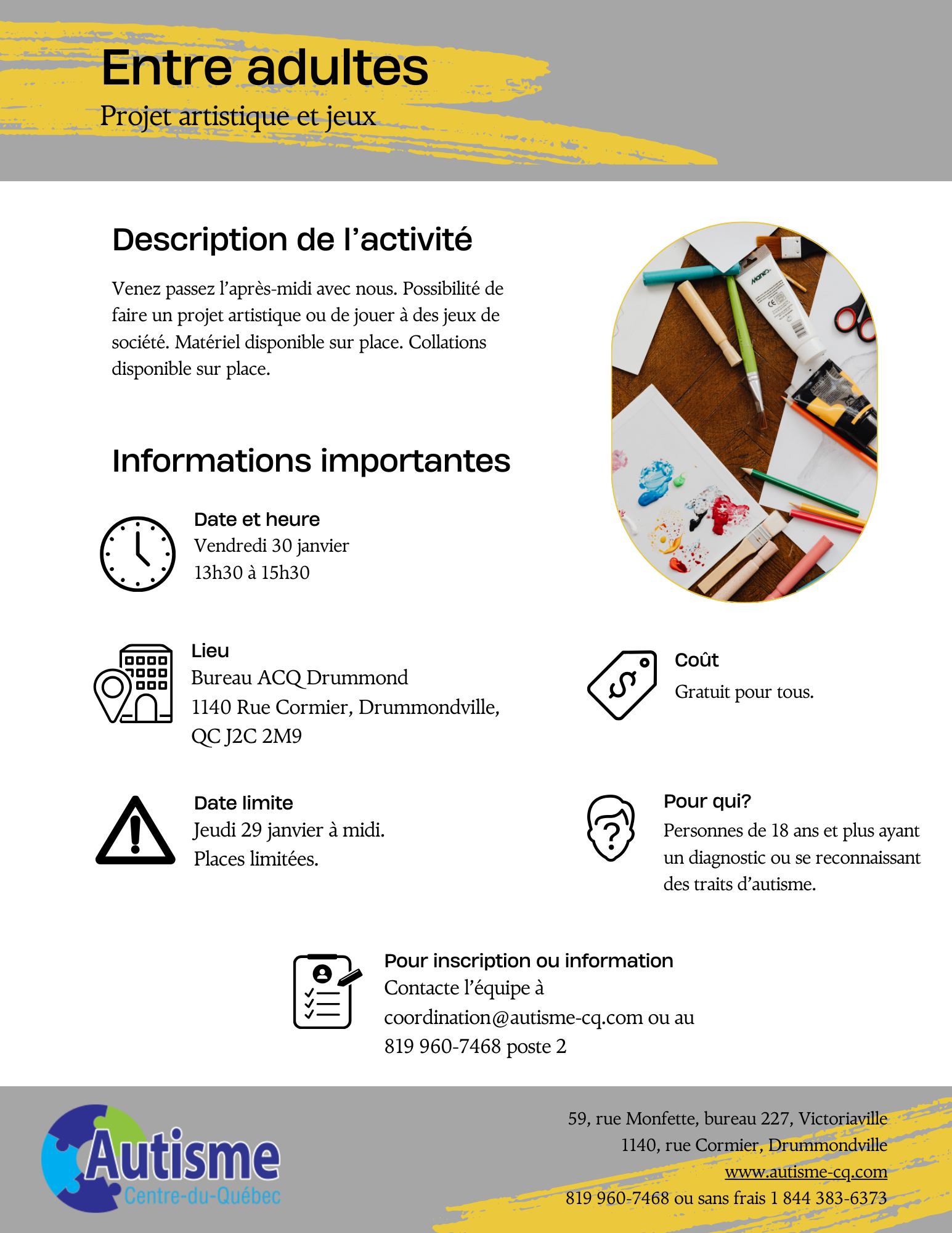 Pour inscription ou information 819 960-7468 poste 2 ou coordination@autisme-cq.com
