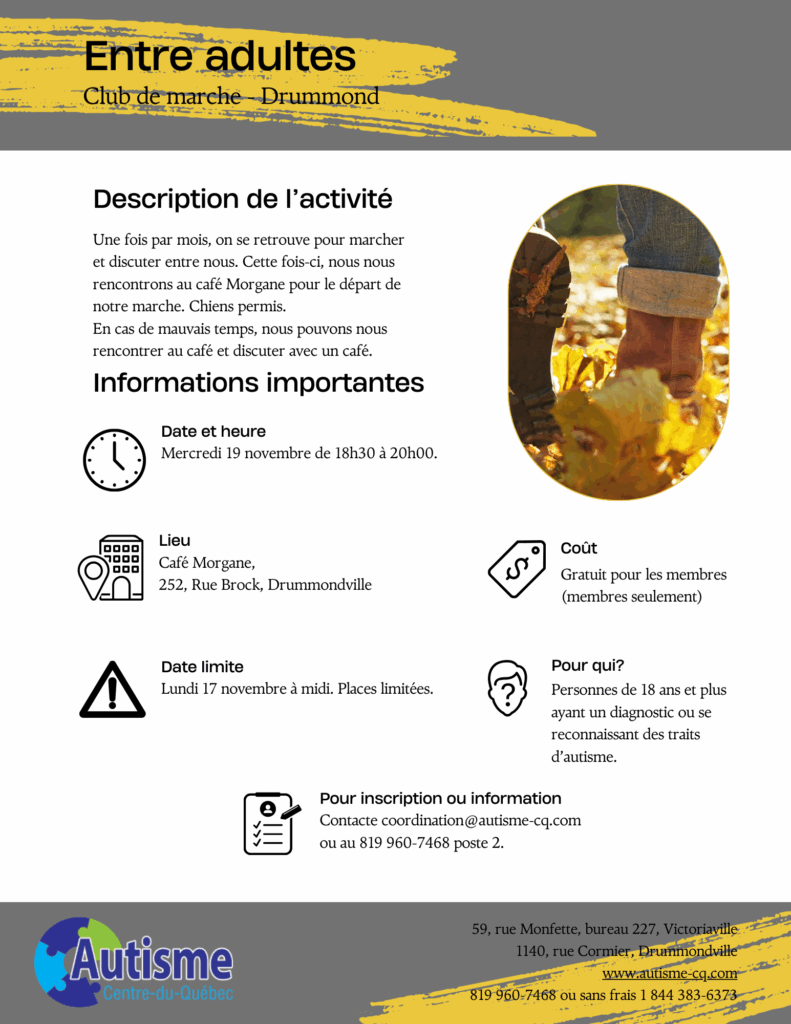 Pour inscription ou information 819 960-7468 poste 2 coordination@autisme-cq.com