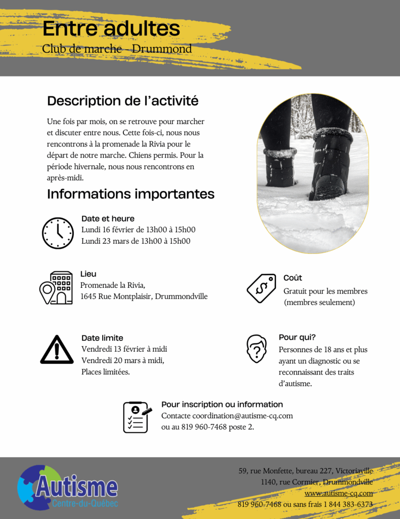 Pour inscription ou information 819 960-7468 poste 2 ou coordination@autisme-cq.com