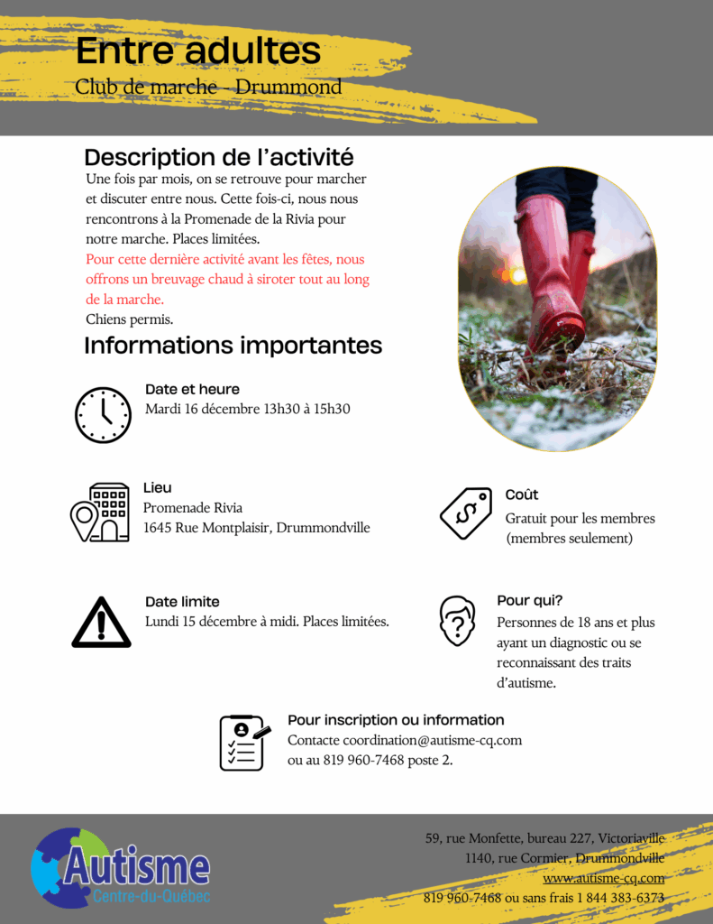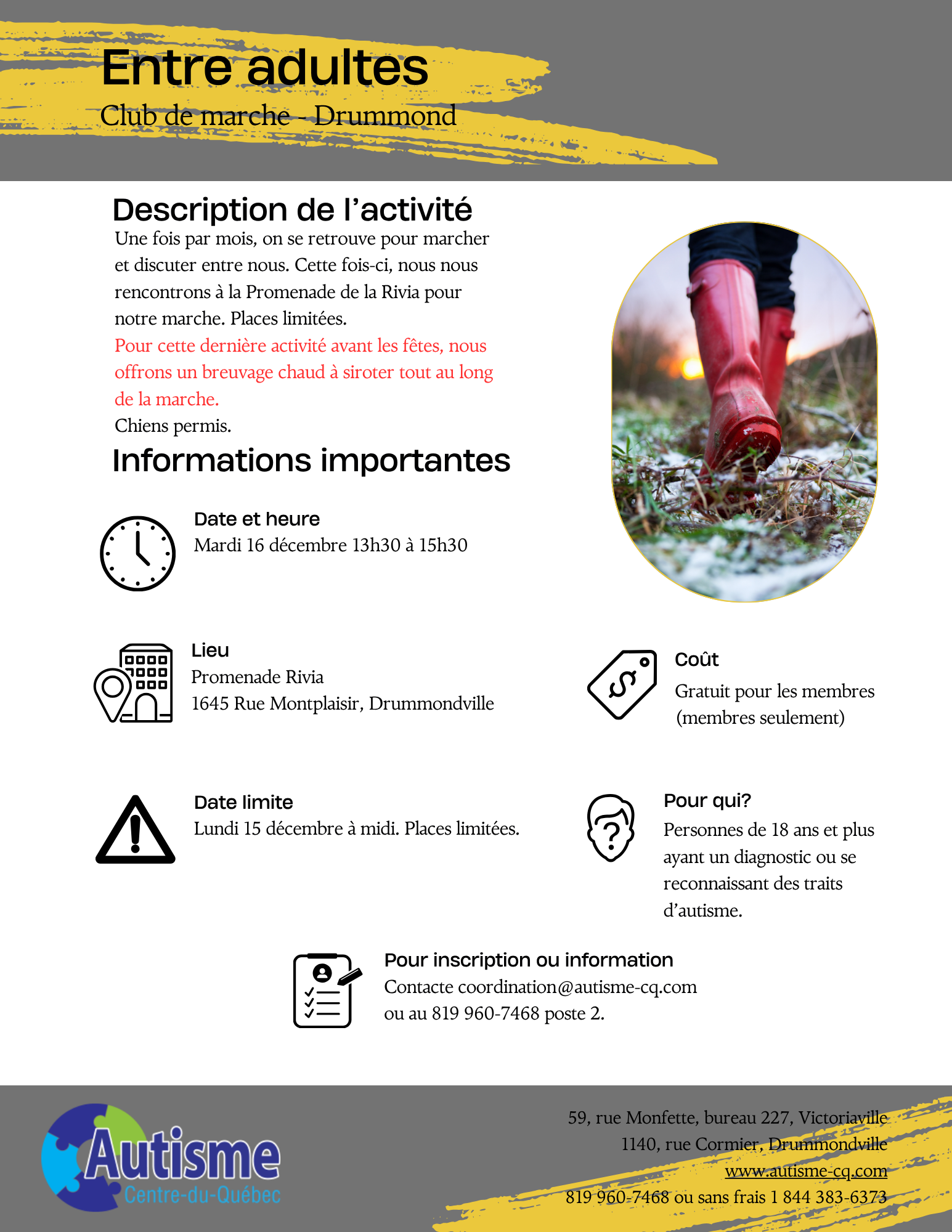 Pour inscription ou information 819 960-7468 poste 2 ou coordination@autisme-cq.com