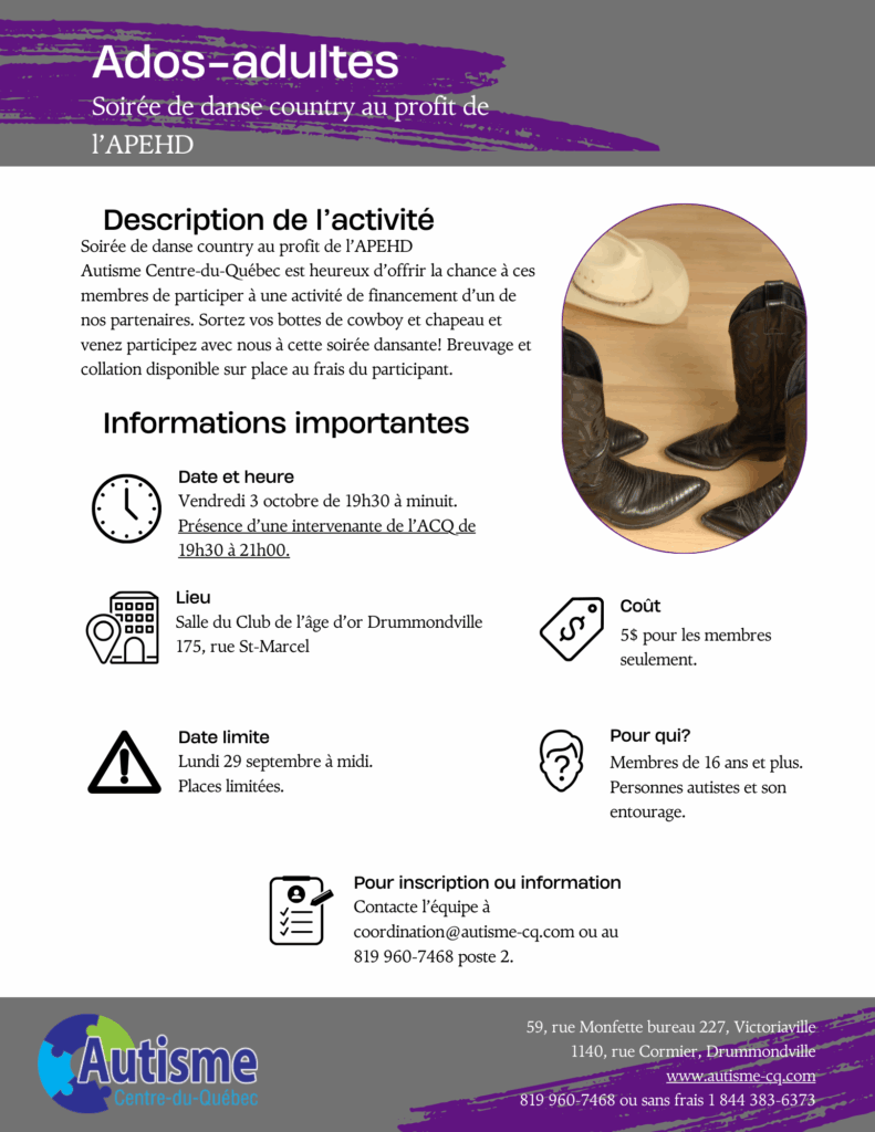 Autisme Centre-du-Québec est heureux d’offrir la chance à ces membres de participer à une activité de financement d’un de nos partenaires. Sortez vos bottes de cowboy et chapeau et venez participez avec nous à cette soirée dansante! Breuvage et collation disponible sur place au frais du participant.