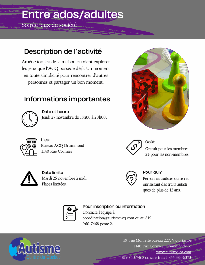 Pour inscription ou information 819 960-7468 poste 2 coordination@autisme-cq.com