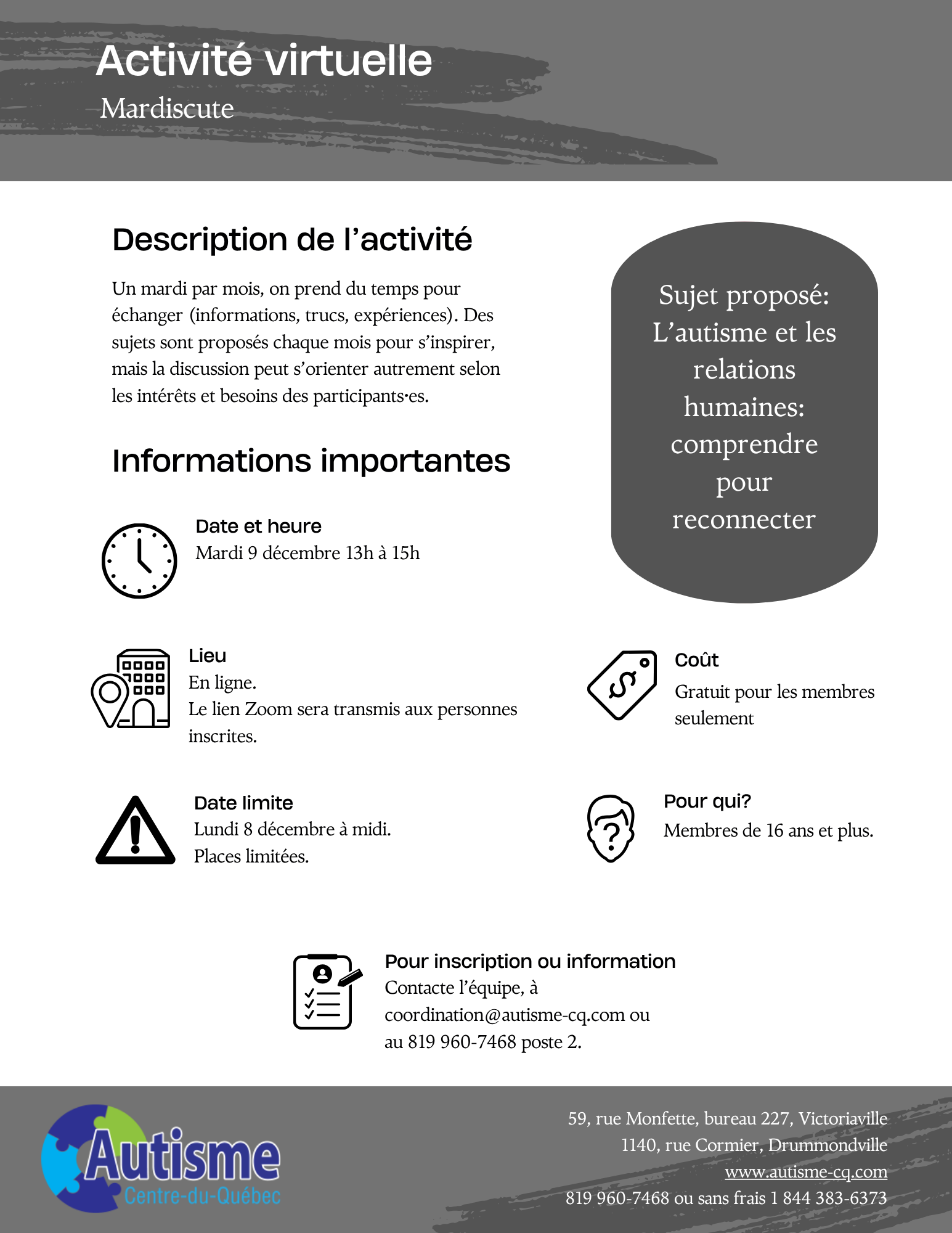 Pour inscription ou information 819 960-7468 poste 2 ou  coordination@autisme-cq.com