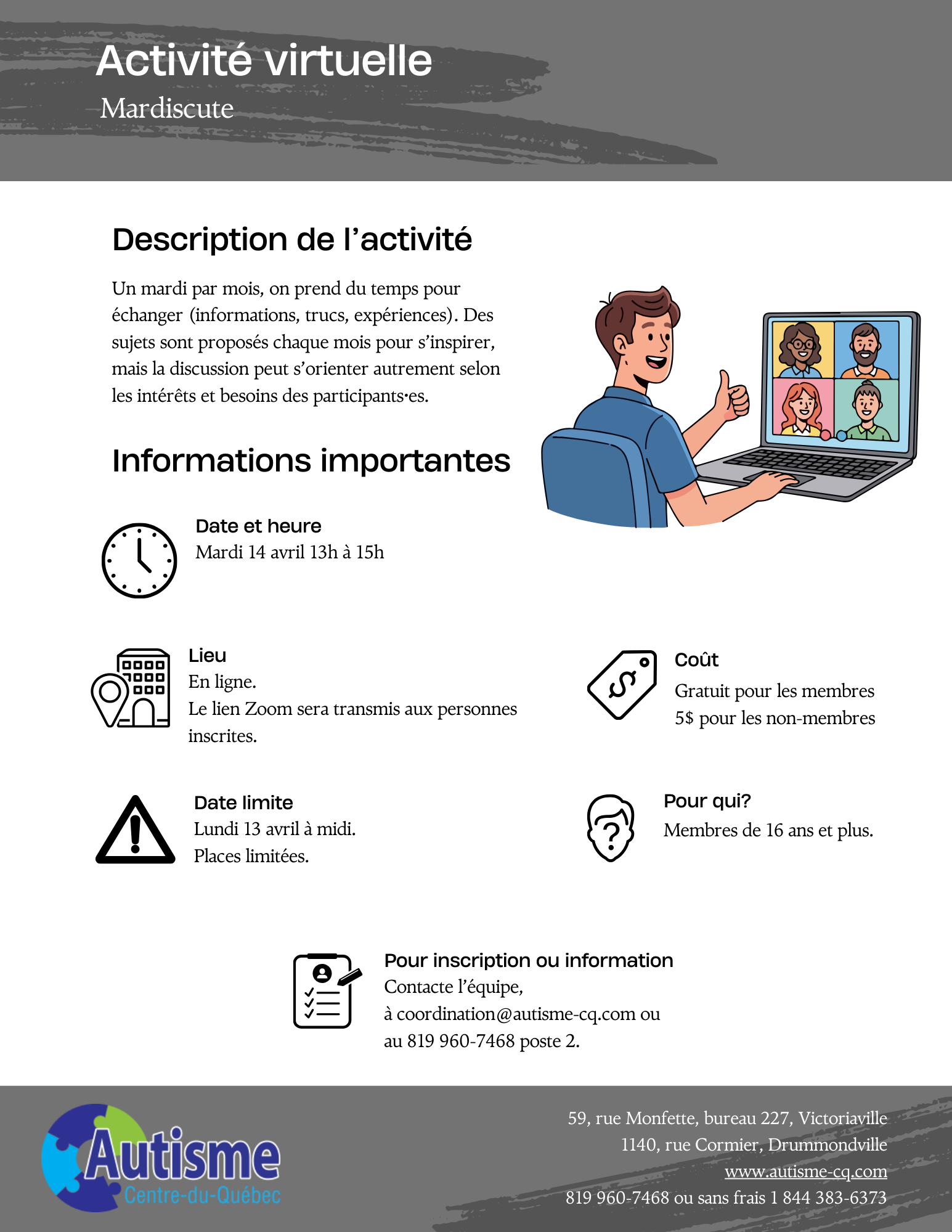 Pour inscription ou information 819 960-7468 poste 2 ou  coordination@autisme-cq.com