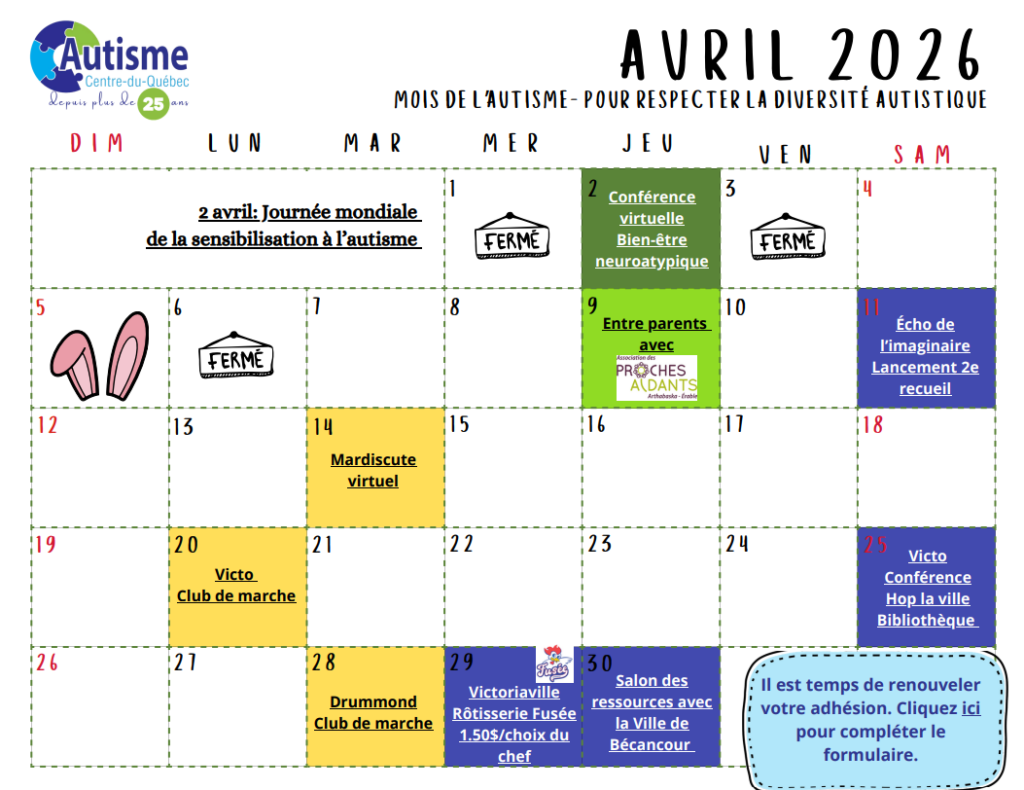| Lundi 14 avril | Café Causerie chez Entraide Bécancour pour parler d’autisme |